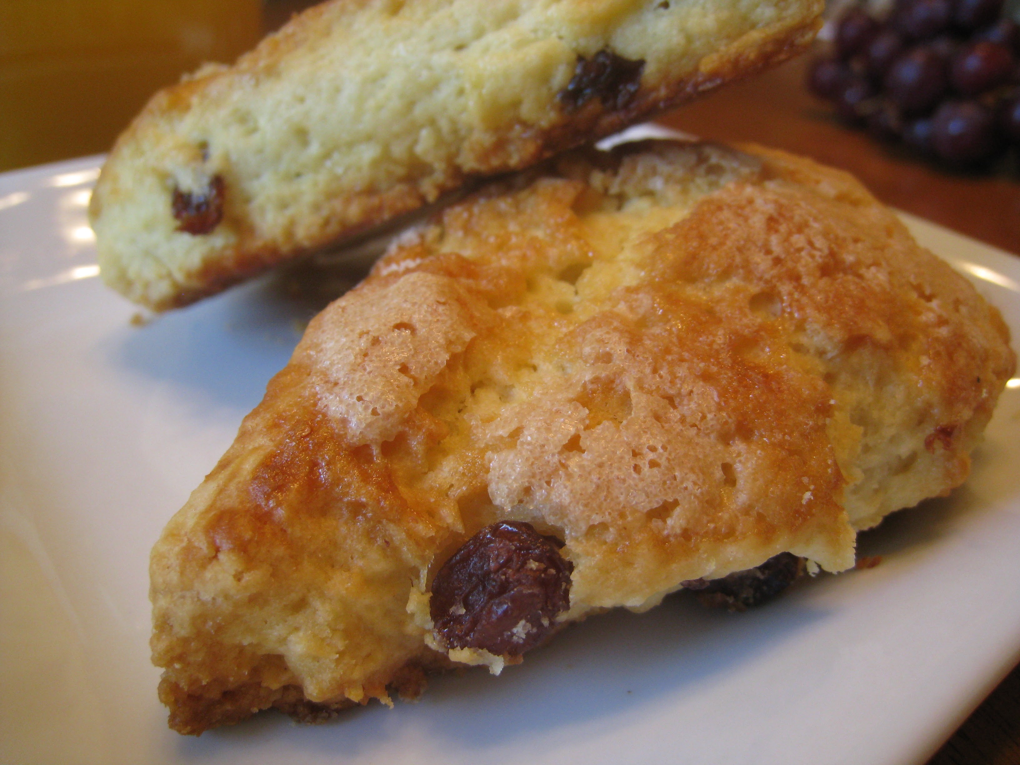 Combine 4 cups flour, 2 tablespoons sugar, the baking powder, and salt in an electric mixer fitted with a paddle attachment. Blend in the cold butter at the lowest speed and mix until the butter is in pea-sized pieces. Combine the eggs and heavy cream and quickly add to the flour/butter mixture. Combine until just blended. Combine the raisins and 1 tablespoon flour and then add to the dough and mix quickly. The dough may be a bit sticky.