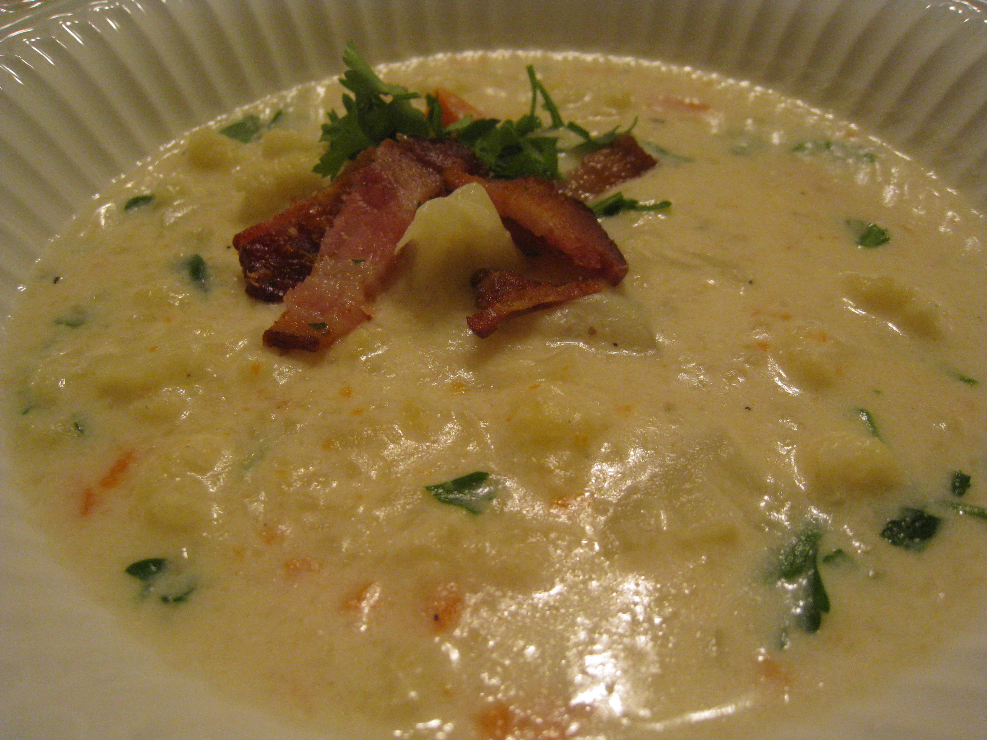I got a head of cauliflower in my organic box this past week and I was really excited so that I could try this recipe. Cauliflower is pretty bland and I usually fix it in an Indian curry but this soup is so flavorful! Here is the original recipe. I adapted it so that it wouldn’t be so high in calories and it was still exquisite. A perfect vegetarian supper but if you miss the meat, add crumbled bacon on top. We had this along with homemade buttery rolls.