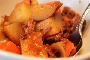 Slow-Cooker Variation: Place beef in a 5-quart slow cooker. Distribute tomato paste, vinegar, and flour over beef; season generously with salt and pepper. Add onions, potatoes, carrots, garlic, and bay leaves. Cover slow cooker; cook on high until beef is fork-tender, about 5 hours (or cook on low heat 8 hours).
