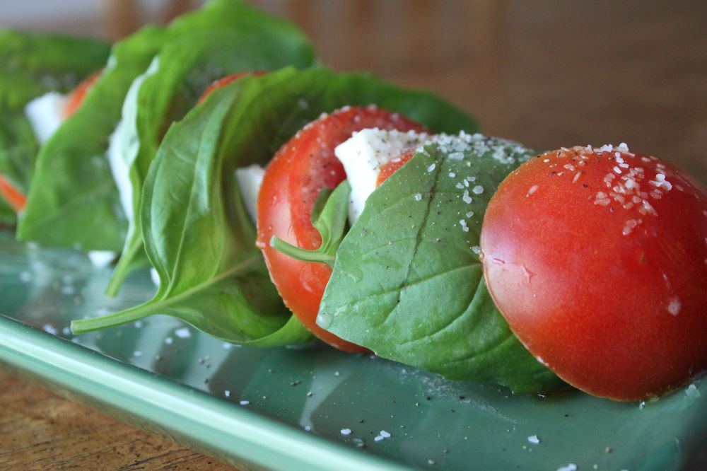 Slice tomatoes and fresh mozzarella into 1/4 inch thick slices. On a platter, alternate tomatoes, cheese, and basil. Drizzle with olive oil and sprinkle salt and pepper to taste.