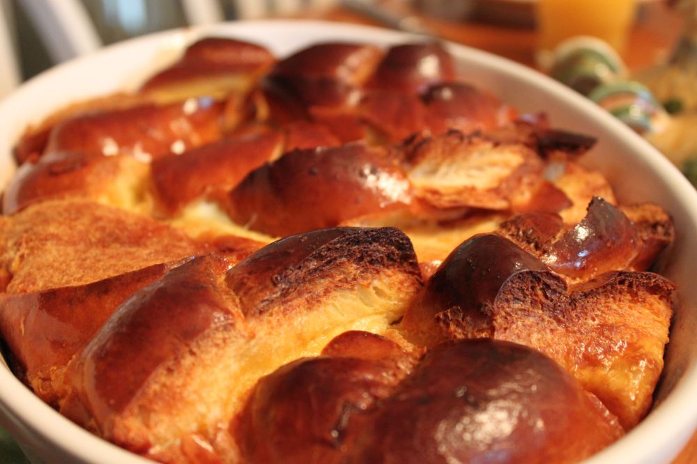 Slice the Challah bread into 1-inch thick pieces. Shingle the slices in a 9 by 14 by 2-inch oval baking dish. Spread the raisins in between the bread slices. (Make sure that the raisins are between the layers of bread or they will burn while baking.) Pour the egg mixture over the bread and allow to soak for 15 minutes, pressing down gently.