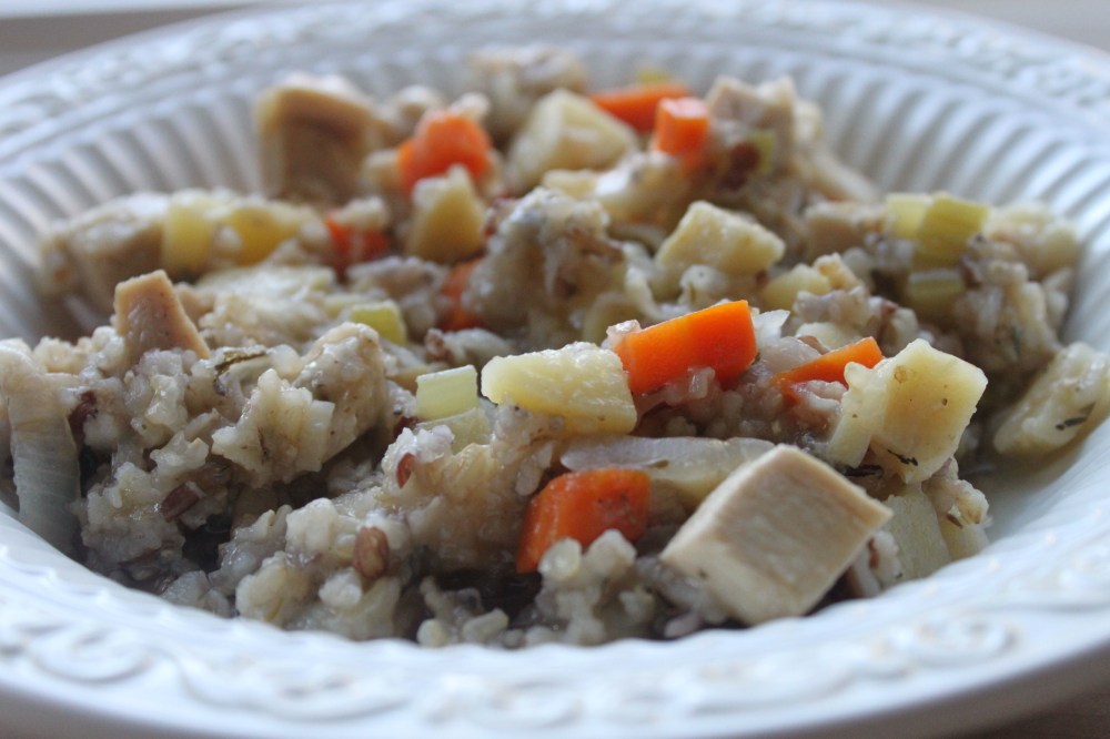 I don’t throw a lot of food out.  It probably has much to do with how I was raised.  I feel terrible when I throw out a moldy piece of cheese (especially if I paid quite a bit for it) or produce that is looking less than prime.  This recipe is my best attempt to use up every last bit of chicken from a whole roasted chicken.  After carving, I save the carcass (horrible sounding word, I know) and freeze it and then after I have accumulated a few of the above mentioned carcasses (there it is again!), I make homemade stock.  I also freeze leftover fresh herbs like thyme, dill, and sage and throw them into this recipe.