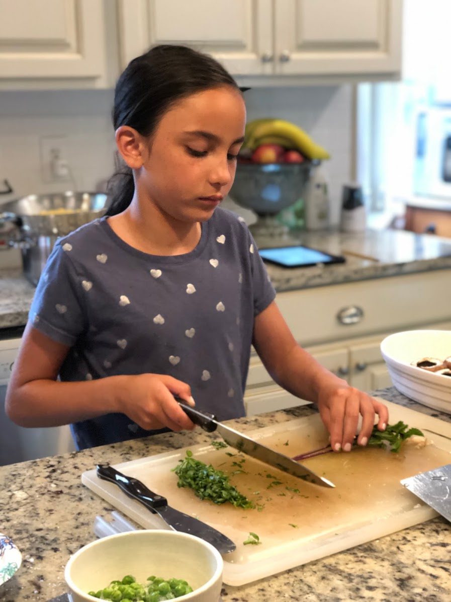 Chopping basil and mint. I forgot how hard using a knife is on little wrists!