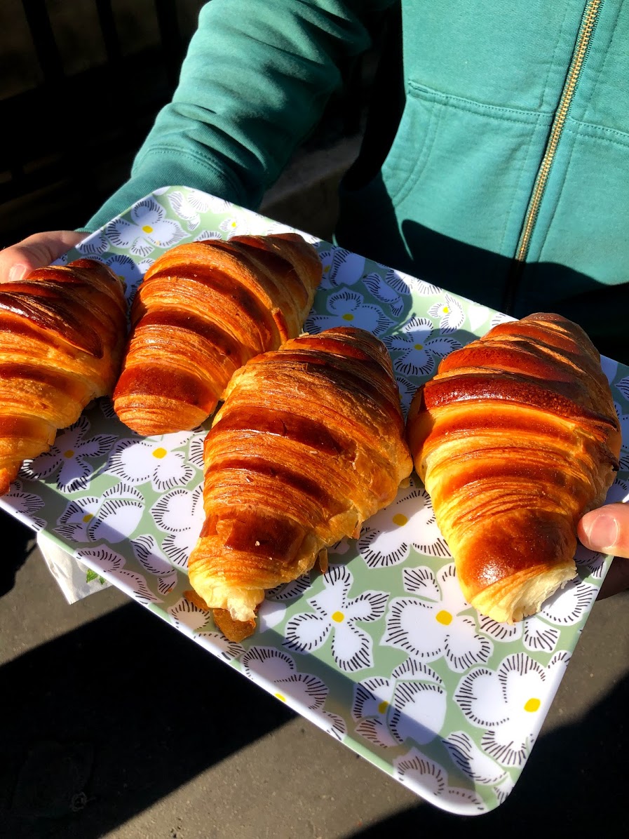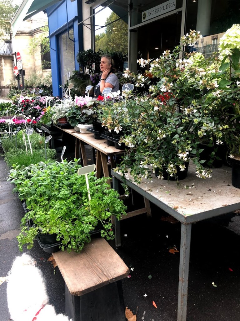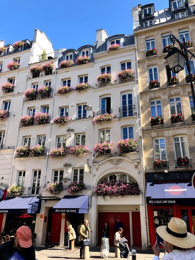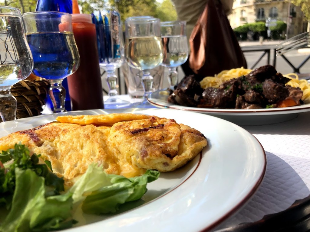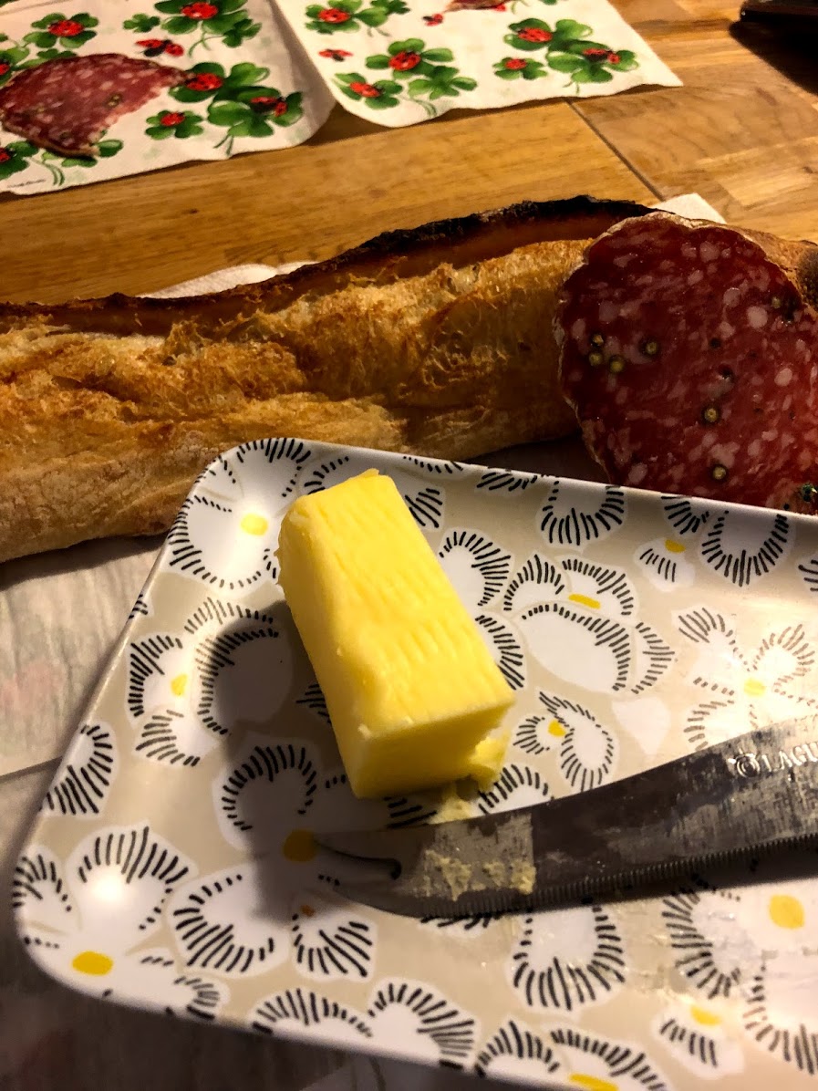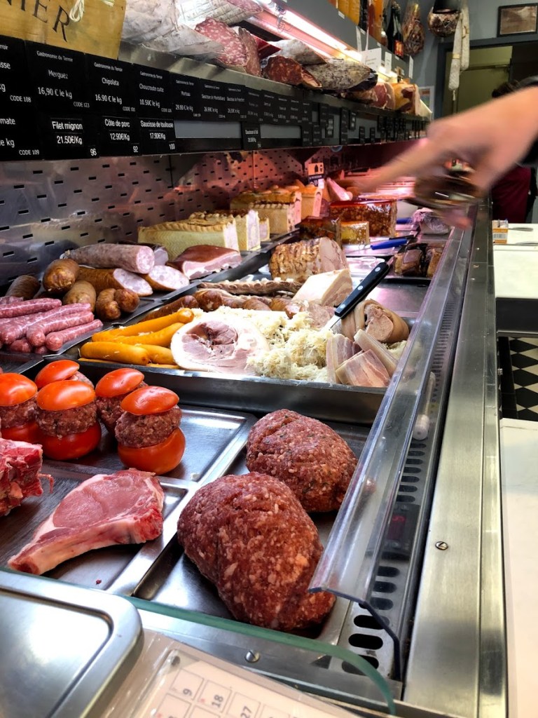 Friday was a day to myself since hubby was working. The original plan was to meet my friend from Germany for the day but those plans changed about a week or so before my trip. I was not too keen about being all by myself touring a museum so I booked a food and wine tour with Paris by Mouth and it ended up being a delicious day! I rode the Metro(!!) and found my tour guide along with 7 other tourists waiting for me (I was the last one to arrive, oops!) in the Saint-Germaine neighborhood of the Left Bank. My tour guide is an American, married to a Frenchman and lives in Paris. She was very knowledgeable and I was envious of how well she spoke French with the locals. Our tour started at La Maison d’Isabelle, a boulangerie owned by a baker in her 30s who has won the award for the best croissant au beurre (croissant made with butter, apparently some are made with margarine. Gasp.) in the city of Paris for 2018. Her pastries and bread looked delectable but we sampled her croissants au beurre, baguette and pavΓ© chocolat (chocolate brick, they do not make this daily so this was a treat). We then meandered next door to the fromagerie, Laurent Dubois who has earned the prestigious honor of Meilleur Ouvrier de France (MOF), a unique title that translates as the best craftsman in France. Here is a brief synopsis on what it means to earn this highly sought after award. At Laurent Dubois, we tasted 3 cow cheeses and 3 goat cheeses, all made with raw milk. One of the cheeses was washed in a walnut liqueur and was originally made by some nuns in an abbey. Next we headed to the charcuterie (next door!) where we tasted pork sausage with peppercorn, pΓ’te de volailles Γ l’estragon (pork pΓ’tΓ© with pistachios layered with chicken pΓ’tΓ© with tarragon); mousse de canard (duck mousse); and rillettes a lβoie (shredded slow-cooked goose).