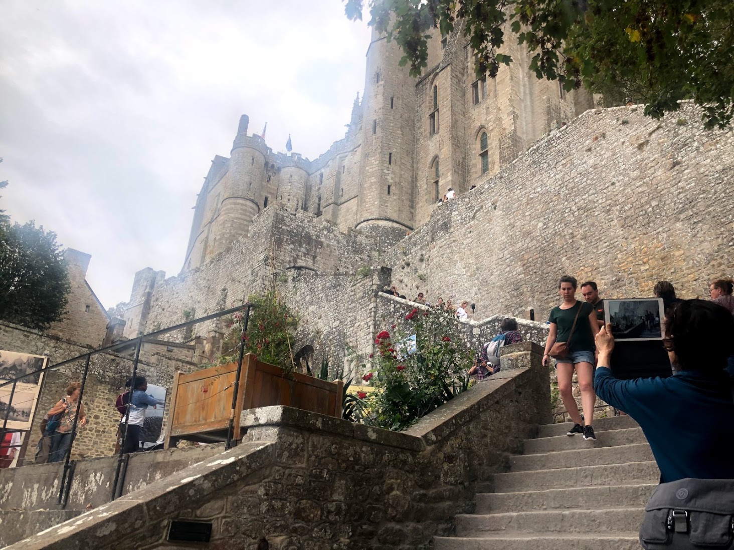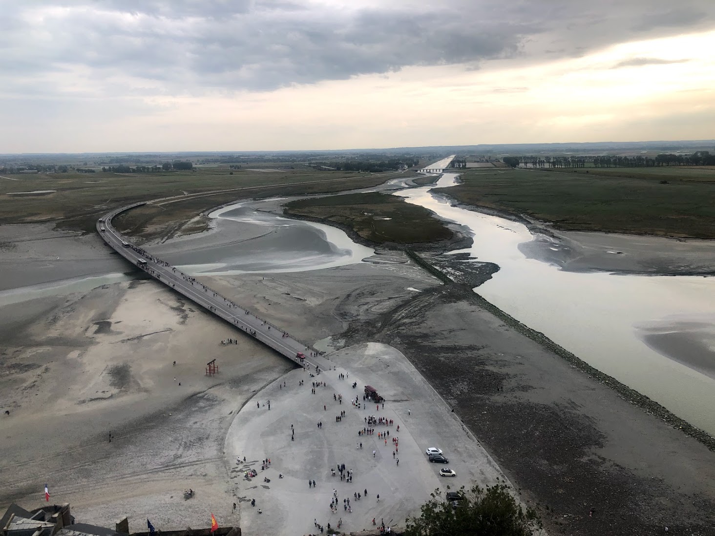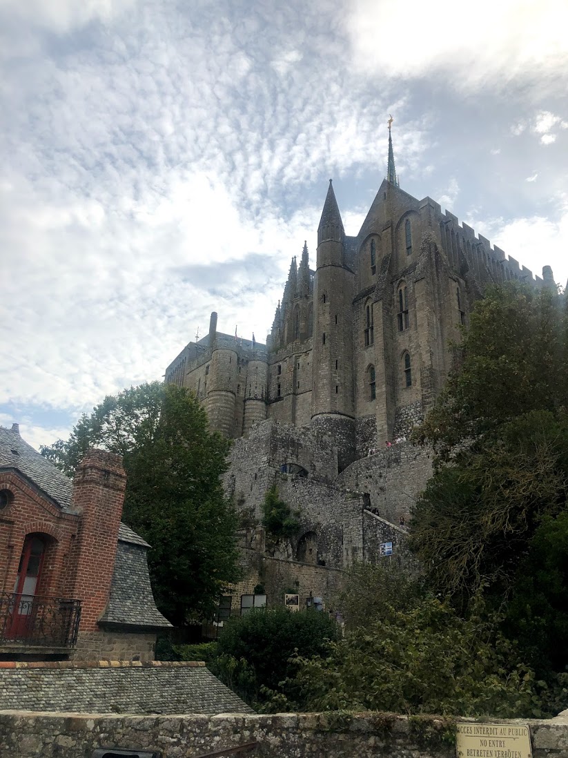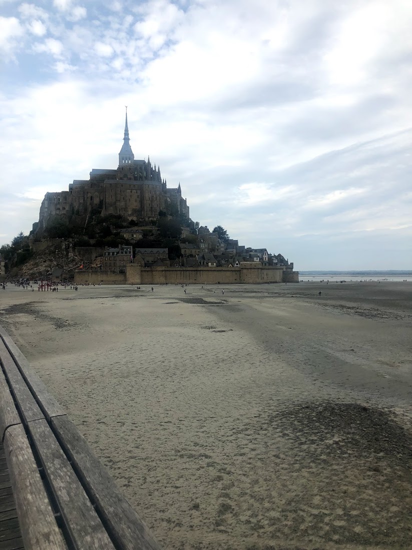 One of the places I really wanted to visit on this particular trip was Normandy, about a 3-hour car ride northwest of Paris. On Saturday morning, we packed up our belongings and left our Airbnb and walked to a local car rental place to inquire about renting a car for 24 hours. We probably should have done this in advance since our only options this late were luxury cars. We scored a sweet ride and hubby got to live out all his fast car dreams while trying to navigate Paris traffic. π We went through lots of tunnels, paid lots of high tolls, filled up with very expensive Diesel gas and three hours later, found ourselves in the town of GenΓͺts in the Normandy region. We wanted to stay here so that we could visit Mont St. Michel, an island that holds a medieval abbey. The abbey is surrounded by water and if at high tide, the Mont St. Michel looks like it is rising out of the water. Sadly, the tides were low that day but equally as beautiful and lots of brave souls walked on the sand surrounding Mont St. Michel. (You are supposed to have a guide help you in case the tide unexpectedly rises while you’re on the sand)