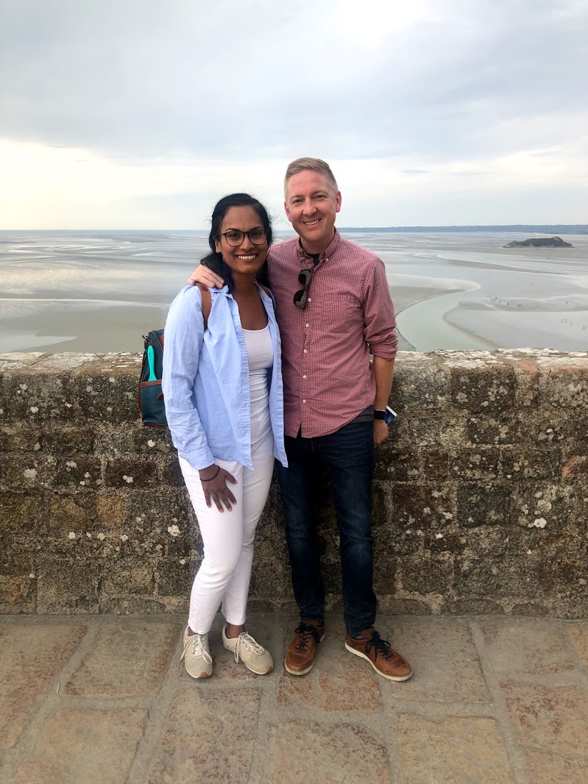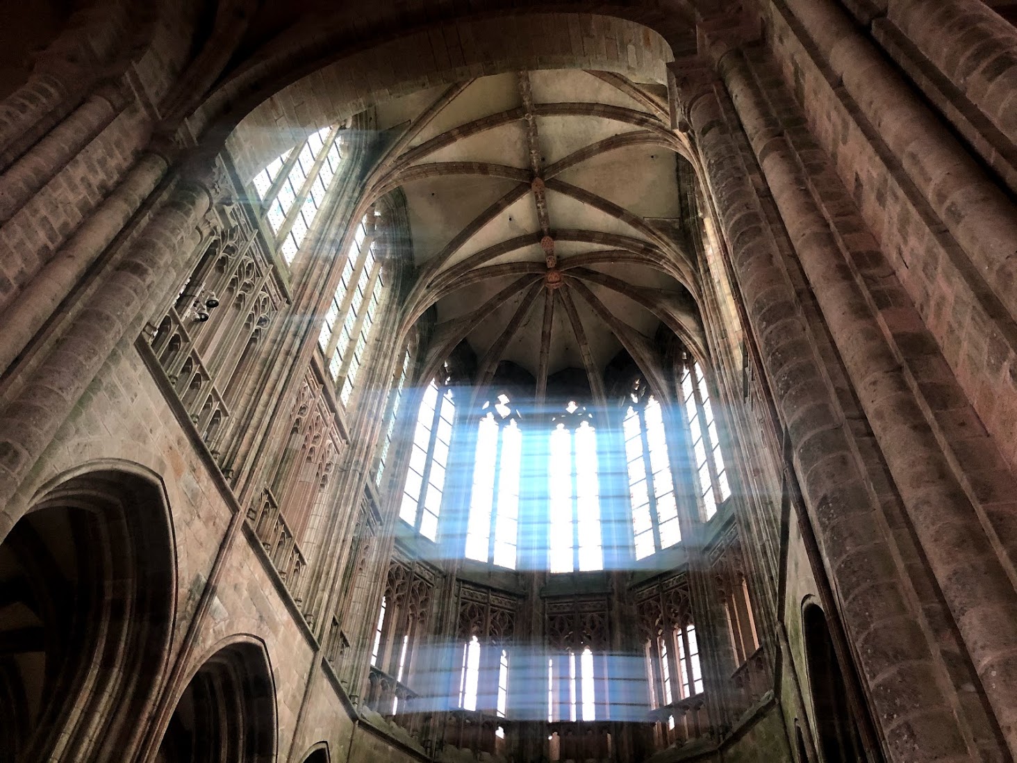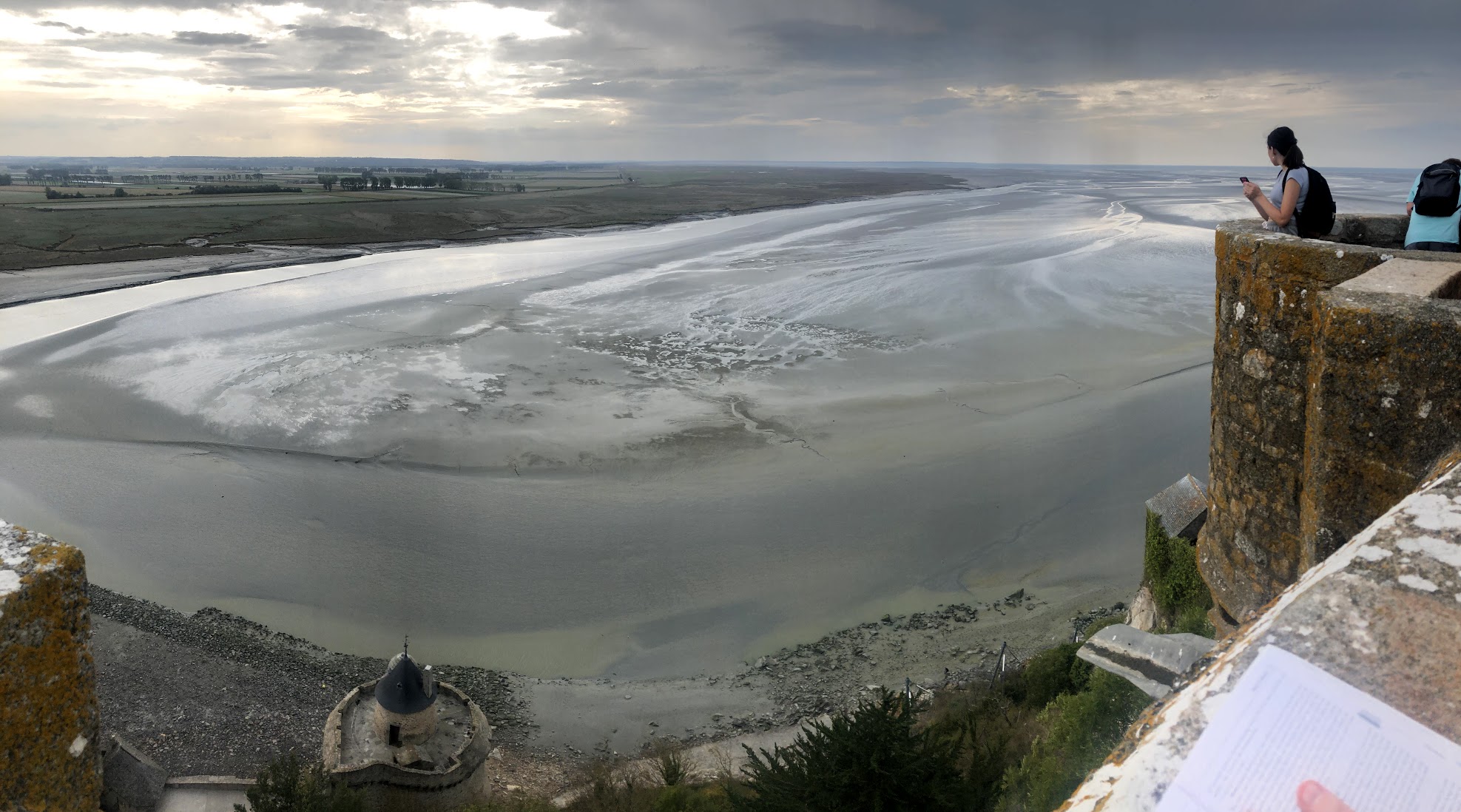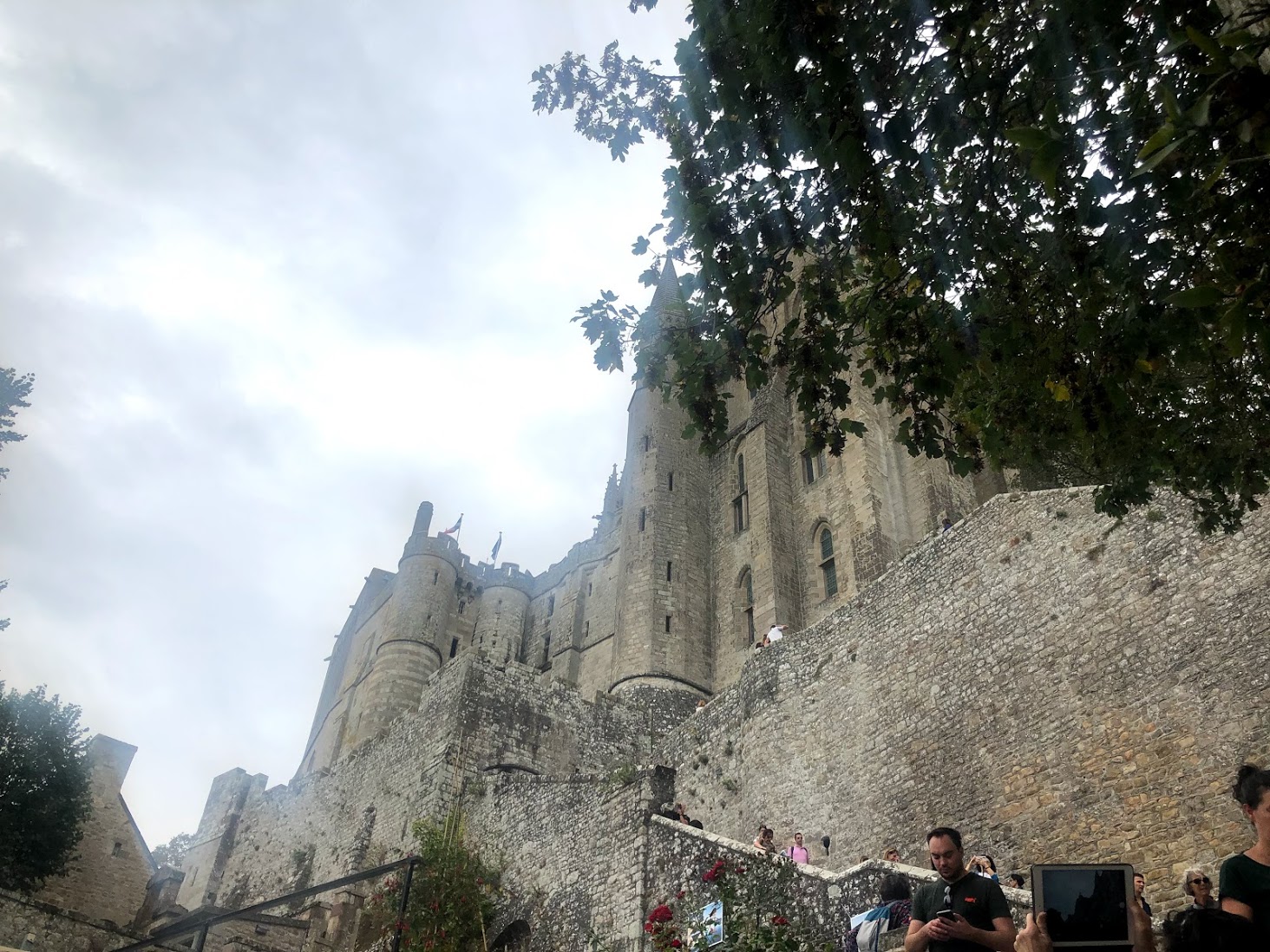 One of the places I really wanted to visit on this particular trip was Normandy, about a 3-hour car ride northwest of Paris. On Saturday morning, we packed up our belongings and left our Airbnb and walked to a local car rental place to inquire about renting a car for 24 hours. We probably should have done this in advance since our only options this late were luxury cars. We scored a sweet ride and hubby got to live out all his fast car dreams while trying to navigate Paris traffic. π We went through lots of tunnels, paid lots of high tolls, filled up with very expensive Diesel gas and three hours later, found ourselves in the town of GenΓͺts in the Normandy region. We wanted to stay here so that we could visit Mont St. Michel, an island that holds a medieval abbey. The abbey is surrounded by water and if at high tide, the Mont St. Michel looks like it is rising out of the water. Sadly, the tides were low that day but equally as beautiful and lots of brave souls walked on the sand surrounding Mont St. Michel. (You are supposed to have a guide help you in case the tide unexpectedly rises while you’re on the sand)