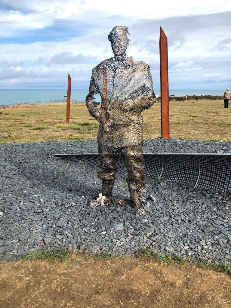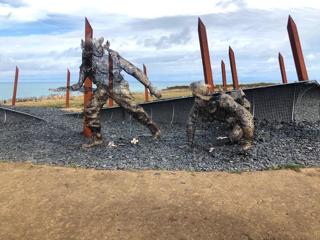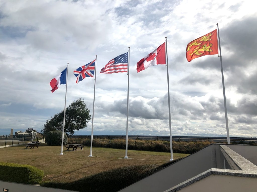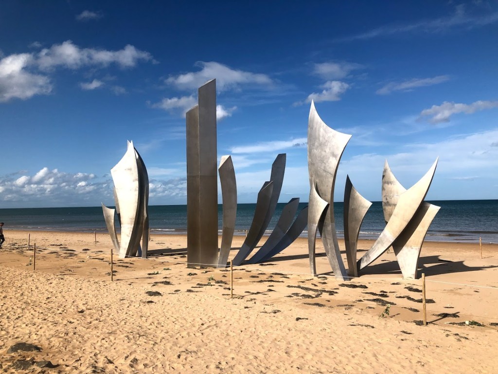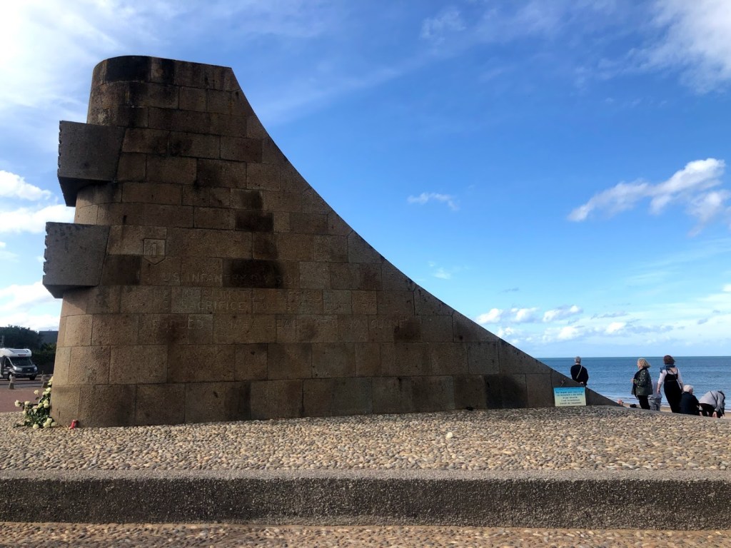 Mont St. Michel was our only planned sight for Normandy but due to a car-free day in Paris (no cars allowed in the city, only pedestrians) on Sunday, September 22, we would not be able to return our car into Paris until 6 p.m. So we decided we’d try and see the D-Day (the French call it Jour J) beaches of Normandy. We woke up early on Sunday and drove two hours from GenΓͺts to Arromanches-les-bains. Our first stop was the Arromanches 360 Degree Theater. This theater shows a powerful 20-minute film called Normandy’s 100 Days. There are 9 screens that surround the viewer and show archived footage and photographs of the work that went into liberating Normandy 75 years ago. The film was very powerful and I will not forget the French woman behind us in the theater weeping openly through the entire film.