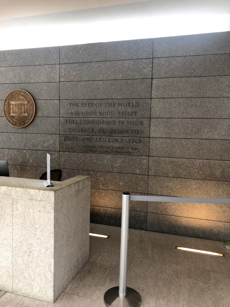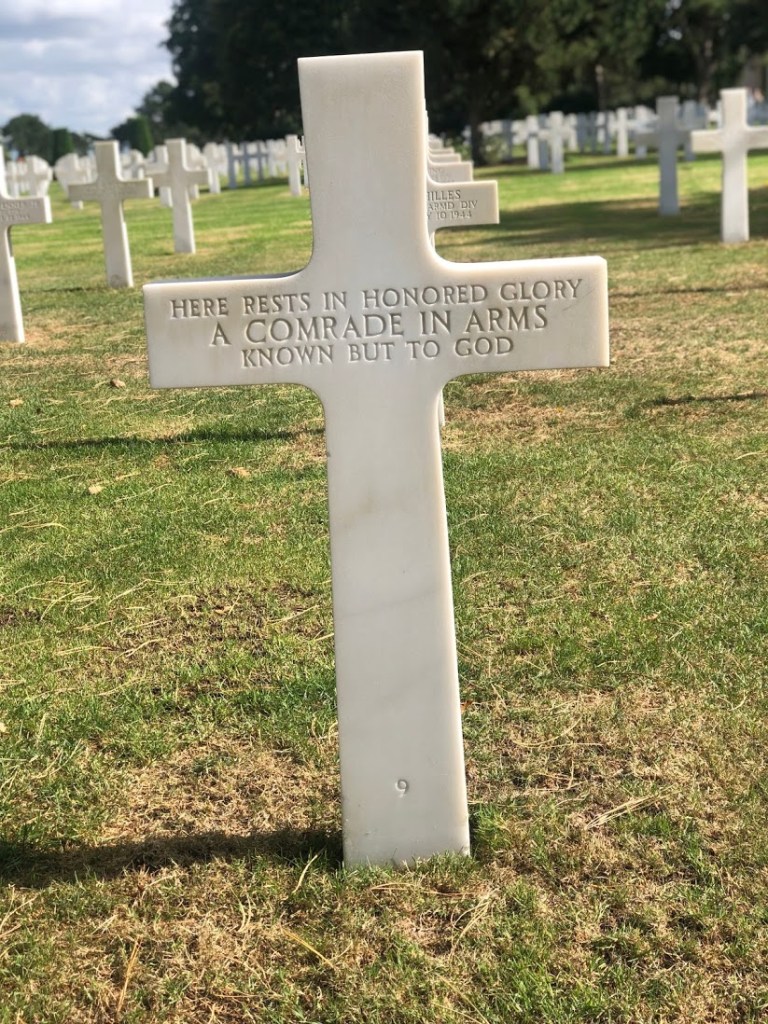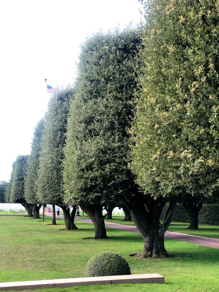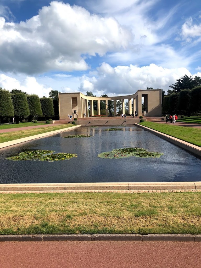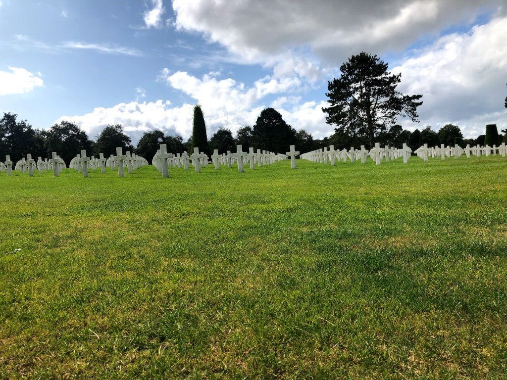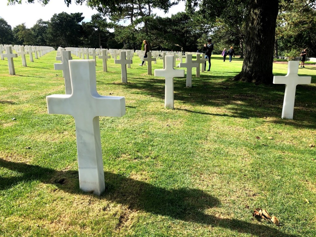 After the walk around the gun battery, we drove to the WWII Normandy American Cemetery. Here there are close to 10,000 tombstones honoring the Americans who gave their lives during WWII. The visitors center was very well done and we could have easily spent more time inside. The most moving part for me was as you exit the visitor center, a voice reads the names of each of the deceased at the cemetery on a continuous loop.